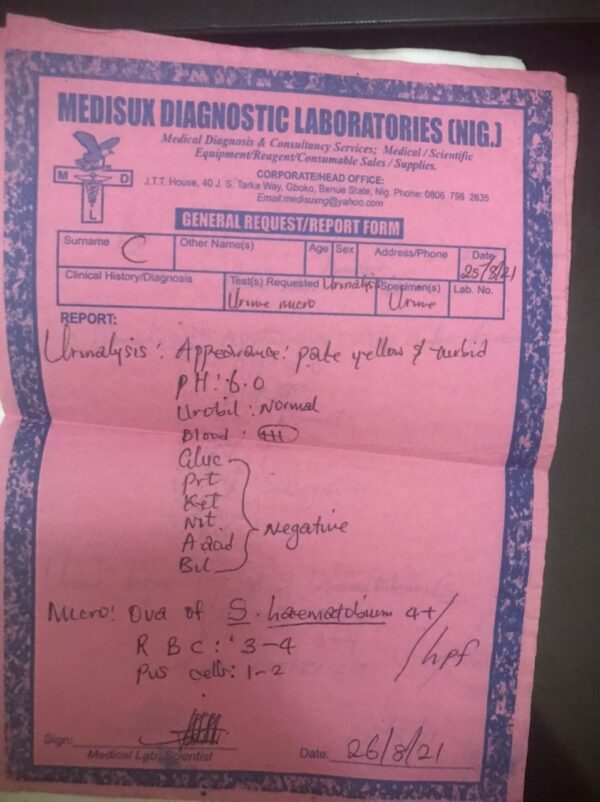 URINALYSIS SHOWS EXCESSIVE SCHISTOSOMA PARASITE